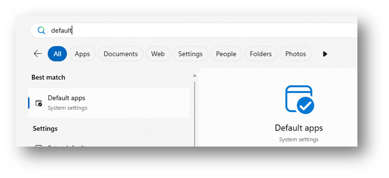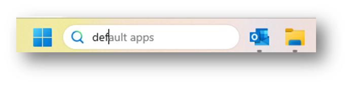 Open the Start Menu by clicking on the windows icon and searching “default apps” or type “default apps” in the menu bar on your windows desktop.