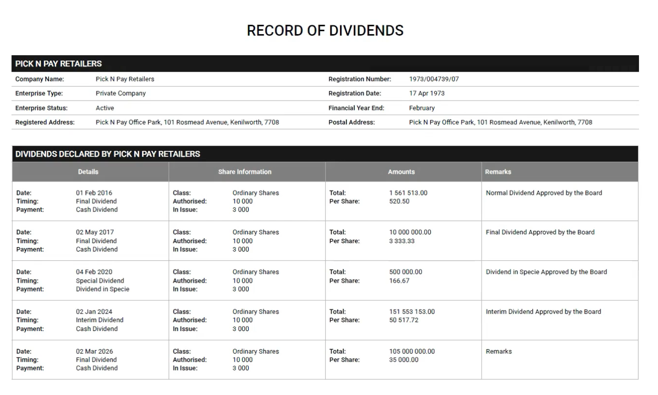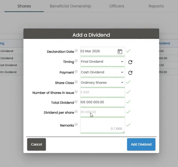 - Generate Resolutions: Instantly produce a board resolution for dividend declarations in PDF format.