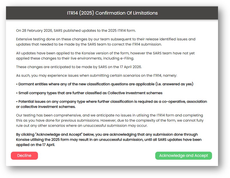 SARS has released several updates to the 2025 ITR14 form. However, due to certain limitations in the tax authority’s current production environment, we have added a disclaimer to the Determinations tab on your ITR14 cards. This ensures you are fully informed of the current filing status as we wait for SARS to finalise their background bug fixes.